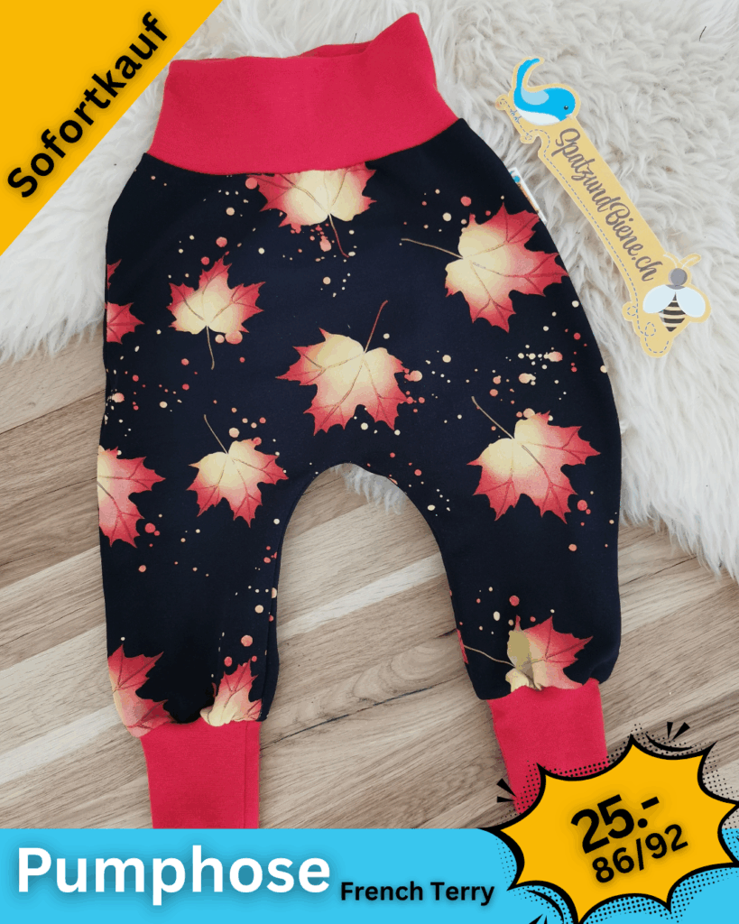 Mitwachsende Pumphosen sind toll – einfach Umfalten und schon sind sie ein paar Centimeter länger. Durch das Bündchen am Bund und den Beinen sind sie sehr bequem und die Kinder haben viel Bewegungsfreiheit.